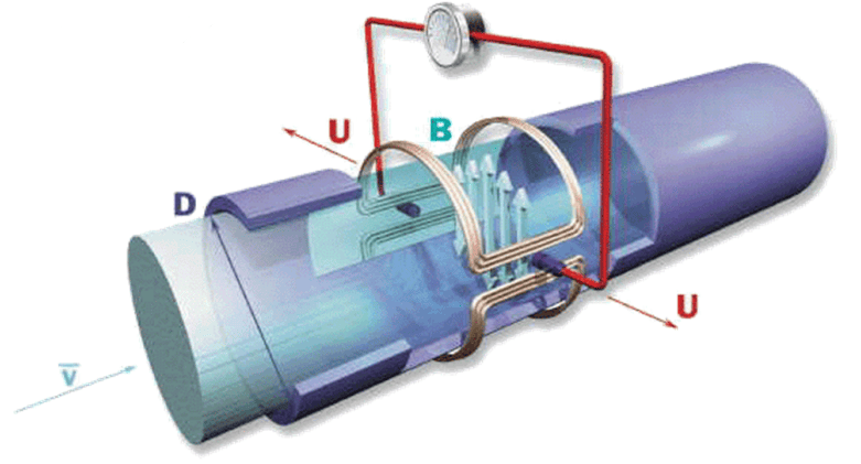 Принцип электромагнитного измерения расхода основан на законе индукции Майкла Фарадея, открытом еще в XIX веке: когда проводящая жидкость проходит через магнитное поле, создаётся электродвижущая сила, напряжение на электродах при этом пропорционально скорости потока среды.